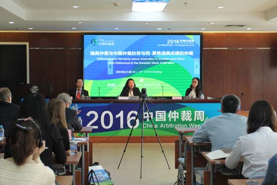 2016年9月26日,由贸仲委与瑞典斯德哥尔摩商会仲裁院(The Arbitration Institute of the Stockholm Chamber of Commerce ,以下简称SCC)联合举办的“瑞典仲裁与中国仲裁的异与同------聚焦瑞典式模拟仲裁”在2016中国仲裁周期间顺利召开。贸仲委王承杰秘书长出席研讨会并致辞。SCC秘书长安妮特·马格努松、贸仲委仲裁院副院长李虎,瑞典维格(VINGE)律师事务所高级顾问、斯德哥尔摩商会仲裁院前主席叶南德(Johan Gernandt)出席会议。 研讨会由贸仲委仲裁院李虎副院长主持。